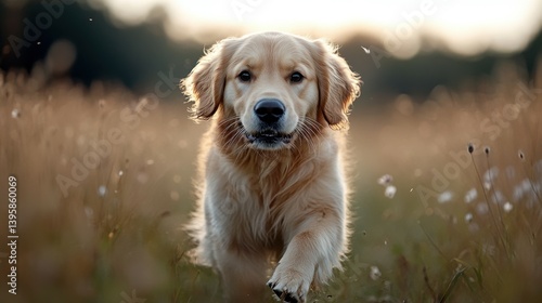 A playful golden retriever puppy running through a flower-filled field
