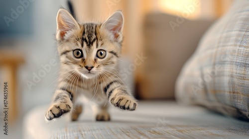A playful kitten chasing sunbeams in a cozy living room, creating a joyful and heartwarming image. The soft, golden light enhances the kitten's playful nature and the cozy atmosphere of the room.