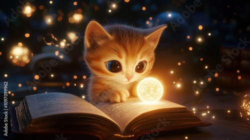 A playful kitten gazes at a glowing orb on an open book, surrounded by magical lights.