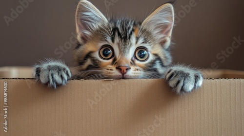 A playful kitten peeking out from a cardboard box, its paws hanging over the edge as it surveys its surroundings with wide, curious eyes.