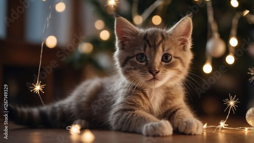 A playful kitten surrounded by warm, festive lights, evoking a cozy holiday atmosphere.