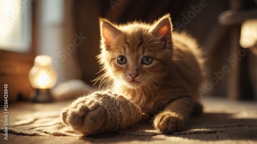 A playful orange kitten with a toy, illuminated by warm light in a cozy setting.