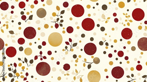 A playful pattern featuring colorful circles and delicate leaves on a light background, creating a cheerful and vibrant design.