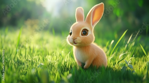 A playful rabbit with big, shiny eyes and a little smile, hopping through a green field, its soft fur glowing in the morning light of the farm.