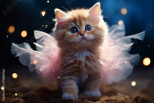 A playful Scottish Fold kitten dressed as a whimsical fairy, complete with gossamer wings and a sprinkle of feline magic in its eyes.