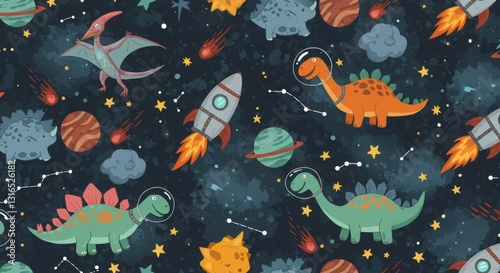 A playful space-themed pattern featuring dinosaurs, rockets, planets, and celestial elements.