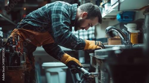 A plumber repairing a broken drainpipe under a sink, showcasing plumbing work and tools