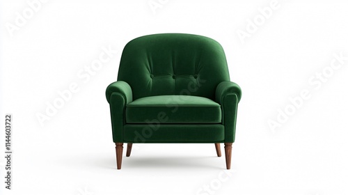 A plush, green armchair with tufted detailing and wooden legs, designed for comfort and style.