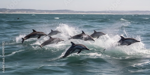 A pod of dolphins jumping in and out of the waves, concept of Marine life behavior, created with Generative AI technology