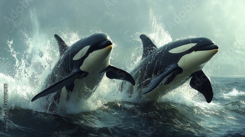 A pod of playful orcas breaching together, sending up massive sprays of water as they create waves in the calm sea, photorealistic