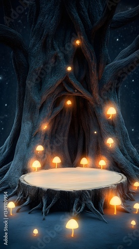 A podium made of twigs and glowing mushrooms, sitting under the roots of a massive ancient tree