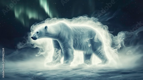 A polar bear walking through a snowy landscape, surrounded by swirling mist and the ethereal glow of the aurora borealis.