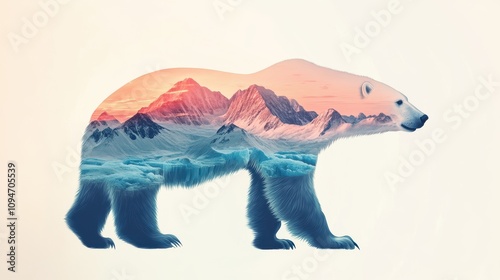 A polar bear walks gracefully with a colorful blend of mountains and dawn colors in its silhouette. This artistic interpretation captures the beauty of nature in a unique style.