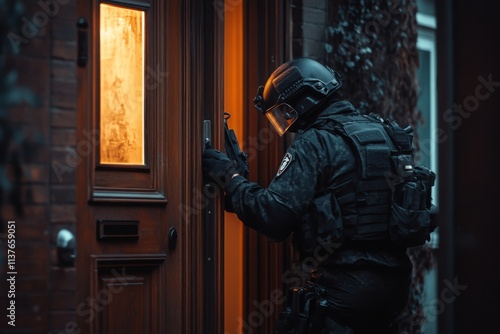 A police officer in tactical gear approaches a door. The scene is tense and dramatic. It suggests a critical moment. The image captures urgency and focus. Generative AI