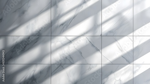 A polished white marble wall displaying smooth stone textures and diagonal sunlight shadows, highlighting luxurious minimalist design and architectural details in high contrast lighting.