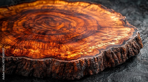 A polished wooden slab showcasing intricate grain patterns and rich colors.