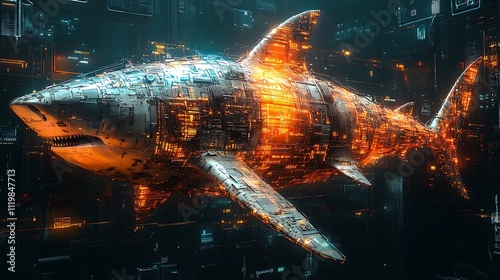 A polygonal shark face designed with metallic elements and glowing circuits symbolizing AI-driven evolution