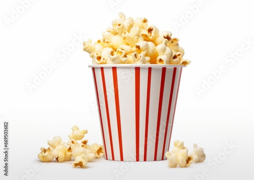 A popcorn viewed red float paper cup with popcorn on white isolated background
