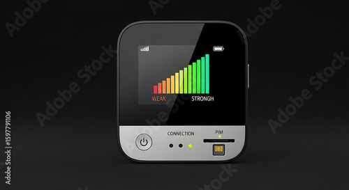 A portable wifi hotspot device showing a strong connection on the display against a dark background ai generated