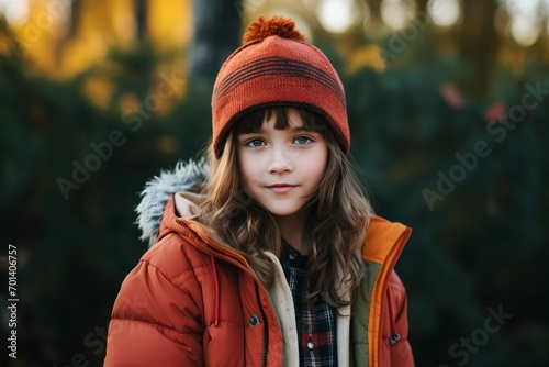 A portrait of a cute little girl in a red coat and hat outdoors.