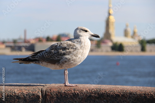 a portrait of a seagull against the backdrop of the Peter and Paul Fortress in St. Petersburg