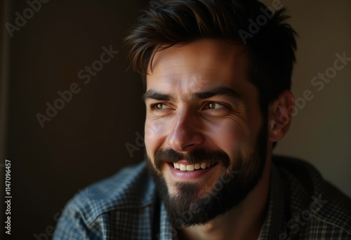 A portrait of a smiling man with a beard, looking off to the side, with sunlight highlighting his face.
