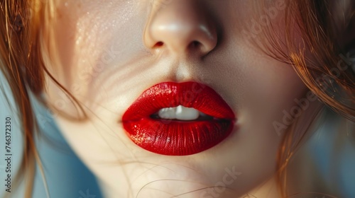 A portrait of a woman with sexy red lips and wavy hair close up.