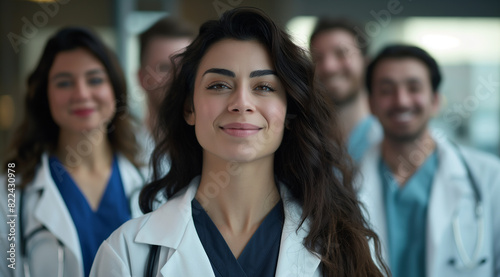 A portrait of an attractive female doctor standing in the middle, smiling and looking at the camera with her team behind her