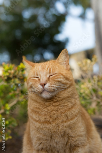 A portrait of an orange tabby cat resting in the square, Republic of Malta.
