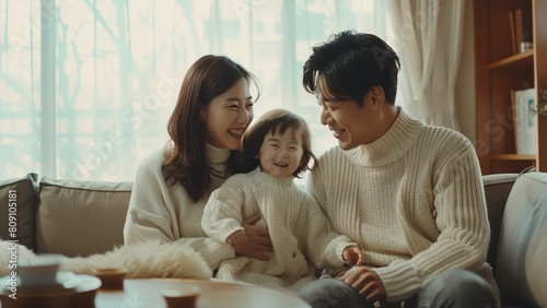 A portrait of happy asian parent with their child laughing all together