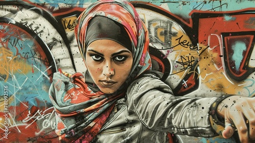 a Portraying a confident Muslim woman in a hijab, surrounded by a fusion of vibrant colors and textures, representing the dynamism and diversity of contemporary modest fashion