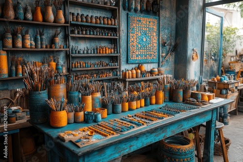 A pottery studio with shelves filled with finished pottery, brushes, and paints, with a blue wooden table in the foreground.