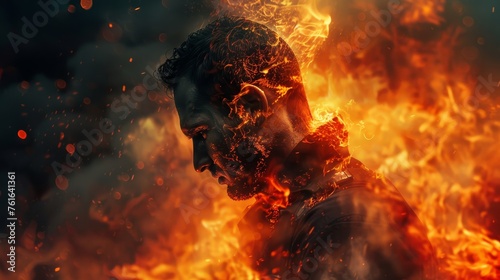 A powerful and emotional portrait capturing a person profile engulfed in flames, symbolizing unyielding courage and the fiery spirit of resilience.
