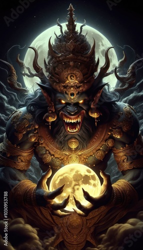 A powerful and fierce depiction of Rahu, the celestial deity, preparing to devour the full moon. Rahu’s face is adorned with intricate golden details and a towering crown, his expression menacing wit