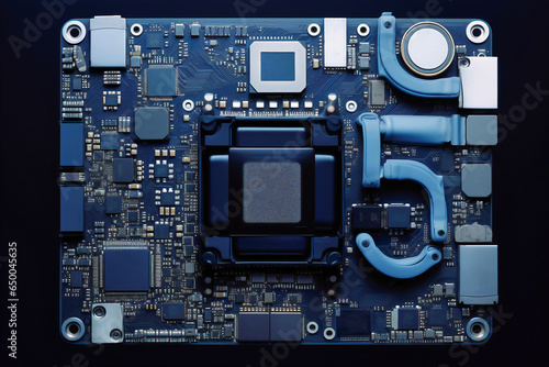 A powerful computer processor or chip on a motherboard. Modern technologies. Blue background.