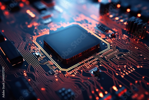 A powerful computer processor or chip on a motherboard. Modern technologies. Red background. Modern electronics production.
