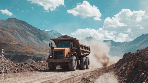 A powerful dump truck navigates a rugged landscape, transporting materials amidst dust and mountains under a bright blue sky.