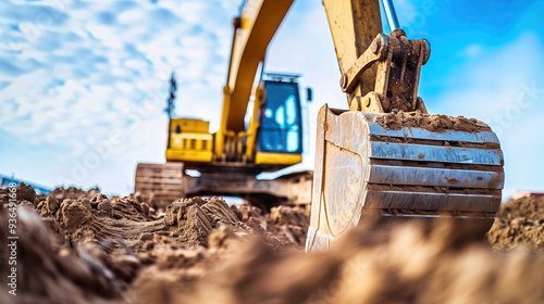 A powerful excavator works diligently, its robust arm penetrating the earth as it prepares the ground for construction. The sky is vibrant with soft clouds above