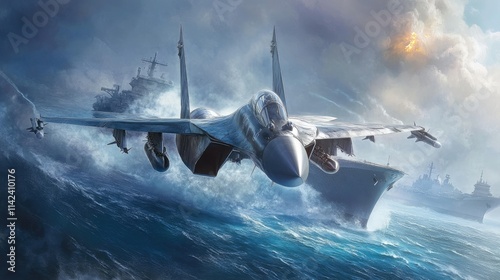 A powerful fighter jet flying over the ocean, with an aircraft carrier and ships in the background, ideal for defense or aviation-themed content, with room for text.