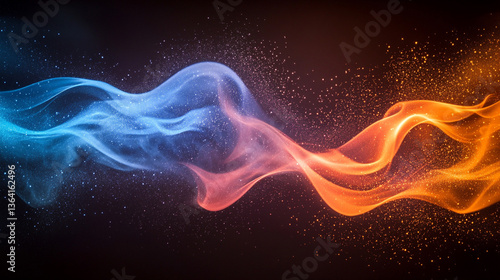 A powerful fusion of red and blue energy beams swirls through thick smoke, symbolizing motion, transformation, and the merging of opposing forces in a futuristic, dynamic abstract scene