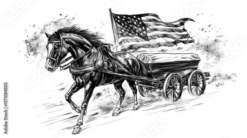 A powerful horse pulling a wagon adorned with the American flag, symbolizing strength and patriotism.