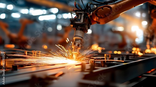 A powerful industrial robot arm precisely welding a steel frame in a busy factory creating dramatic bursts of bright sparks as it works