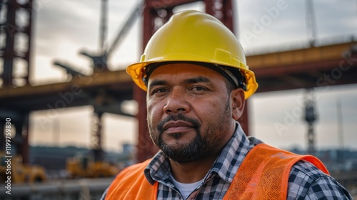 A powerful portrait of a construction worker on a bridge site, wearing a hard hat and reflective vest, steel beams and cranes in the background
