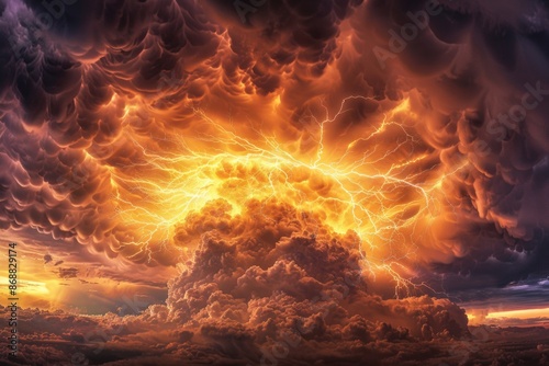 A powerful storm cloud with lightning bolts emerging from the dark grey clouds