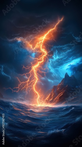 A powerful storm god controlling lightning in a darkened sky, mountains in the background
