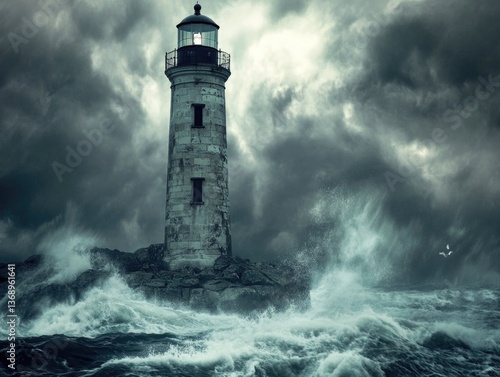 A powerful storm hits the ocean as a beacon shines through the darkness, suitable for use on weather or navigation-related themes