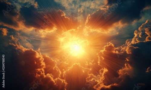 A powerful sun with a halo of glowing light rays, creating an otherworldly gateway to heaven