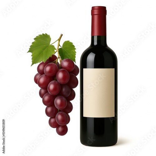 A premium red wine bottle mockup with a blank label and a fresh grape cluster, isolated on a white background — ideal for branding, packaging design, vineyard promotions, and fine dining campaigns