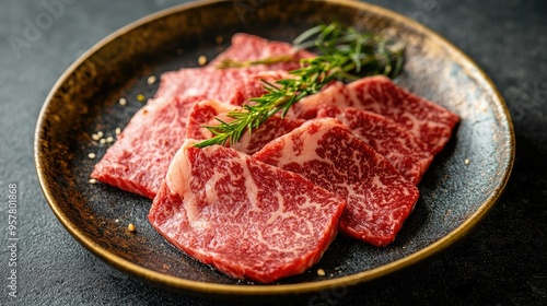 A premium set of raw Wagyu A5 beef slices, ready for yakiniku, arranged on a plate with herbs. Rich marbling and color make it a stunning choice for culinary visuals.