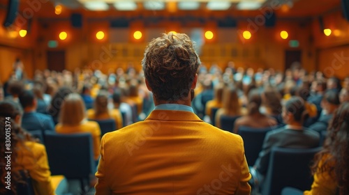 A presenter in a yellow jacket addresses a large audience in a conference hall, creating a focused and engaging atmosphere under warm lighting.